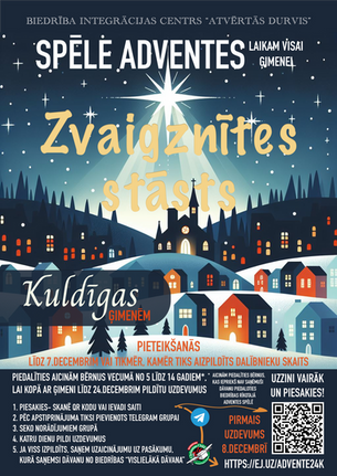 Sagaidot Ziemassvētku laiku, kā jau ierasts piedāvājam Ventspils, Kuldīgas un Liepājas ģimenēm pievienoties Adventes spēlei "Zvaigznītes stāsts". Tā ir iespēja ģimenēm kopā pavadīt laiku, pildot Adventes kalendāra uzdevumus (rokdarbi, aktivitātes laukā, video noskatīšanās). Daži no uzdevumiem būs obligāti, bet daļa, lai rosinātu radošu, aktīvu un lietderīgu brīvā laika pavadīšanu, veicinot ģimenes labbūtību.